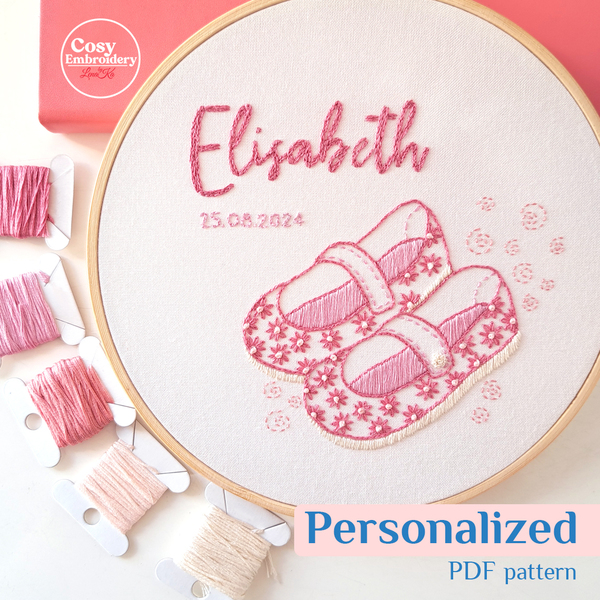 Personalized Baby Name Embroidery Pattern PDF Custom Pink Floral Girl Shoes Design Nursery Wall art DIY Birth Announcement Handmade Hoop Art